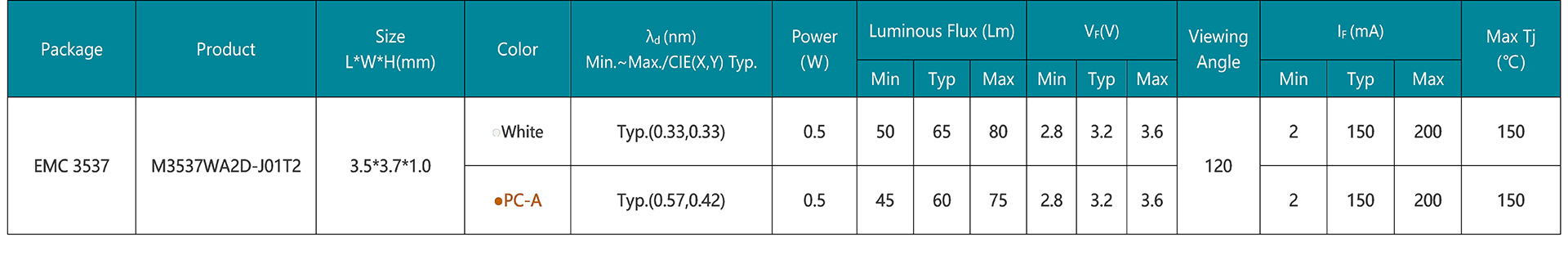 白色EMC封裝/適用于SMT貼片/符合AEC-Q102要求標(biāo)準(zhǔn)/產(chǎn)品發(fā)光角度120°/無鹵環(huán)保/150mA驅(qū)動/MSL 2A/朗伯體發(fā)光